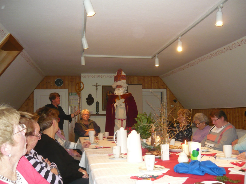 Nach einigen kurzen Geschichten, vorgetragen von Pfr. Riedl, Frau Krause und Frau Neubert, kam noch eine polternde Überraschung zur Tür herein. Bischof Nikolaus war unterwegs und besuchte die Mitglieder des Frauenbundes Röslau und hatte für jede Dame persönlich eine kleine Verszeile voll des Lobes dabei. Danke St. Nikolaus für die nette Überraschung.