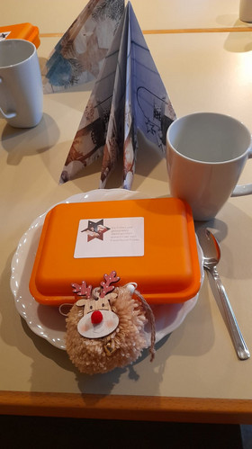 Auf jeden Teller lag auch ein kleines Geschenk: eine Brotzeitbox mit drei selbstgebackenen Lebkuchen, an der Box hing ein Pommel als Elch