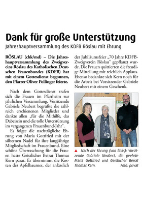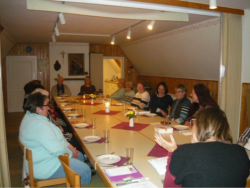 Nach dem Gottesdienst trafen sich die Frauen im Pfarrheim zur jährlichen Versammlung. Die Vorsitzende Frau Gabriele Neubert begrüßte die zahlreich erschienenen Mitglieder, welche ordnungsgemäß schriftlich eingeladen wurden. Sie dankte allen Mitgliedern für die Mithilfe, das Dabeisein und die tolle Unterstützung im vergangenen Frauenbundjahr. Es folgte die Gratulation der Geburtstagskinder. Frau Maria Gottfried wurde nachträglich, sie war an der Jubiläumsfeier im September erkrankt, die Silberne Nadel für langjährige Mitgliedschaft des Frauenbundes verliehen. Eine schöne Überraschung für Maria Gottfried, die nichts davon vorher erfahren hatte.