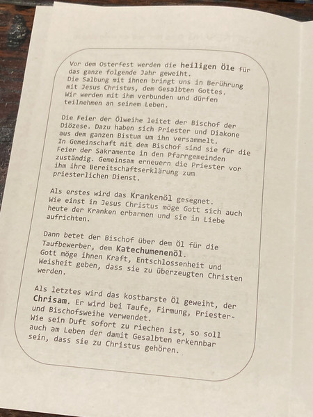 Los ging es ab Marktleuthen mit dem Zug zur Begrüßungsandacht mit Bischof Rudolf und ca. 700 Jugendlichen aus den unterschiedlichsten Pfarreien des Bistums in St. Emmeram. Im Anschluss daran erwarteten die 4 Kinder spannende Workshops in den Marien-Schulen. Der Höhepunkt des Tages war zum Abschluss die Chrisam-Messe mit einer tollen Jugendband im Regensburger Dom. Dort wurden die drei verschiedenen heiligen Öle geweiht. Das Chrisamöl für Taufen, Firmung und Weihen, das Krankenöl für die Krankensalbung und das Katechumenöl zur Vorbereitung auf die Taufe.