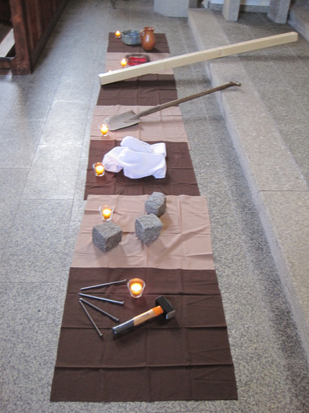 An 8 Stationen wurde mit Bildern von Sieger Köder und Symbolen wie Dornenkrone oder Kreuzesbalken der Weg vom Leiden und Sterben Jesu nachgestellt. Jede Station wurde am Ende mit dem Lied „Seht das Zeichen, seht das Kreuz“ (GL 785/1) und einem kurzen gemeinsamen Gebet abgeschlossen.