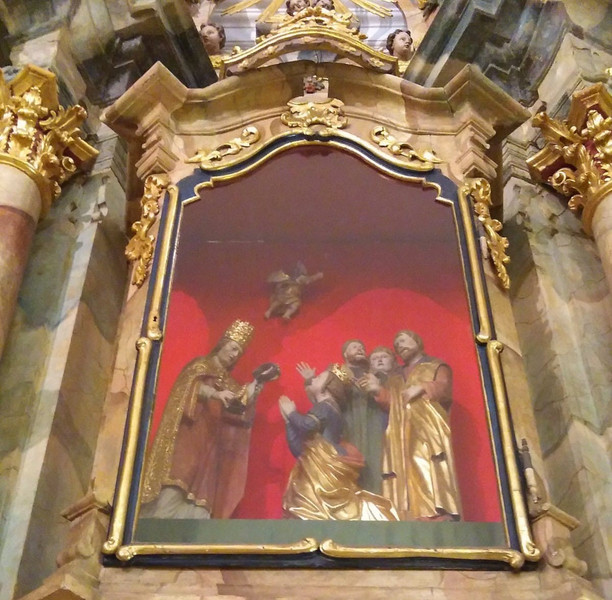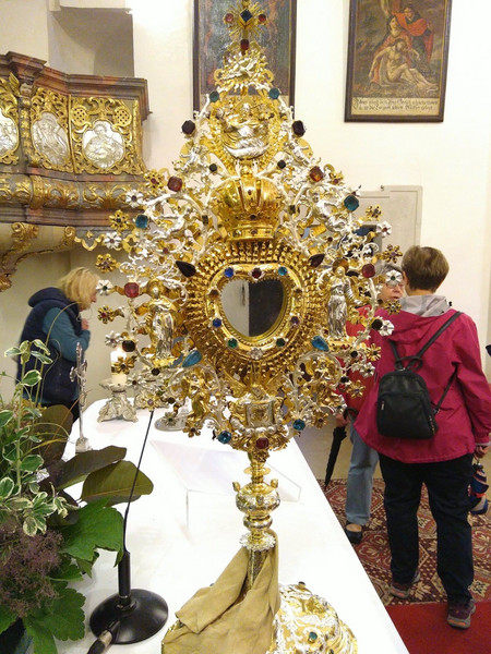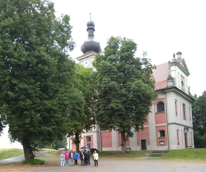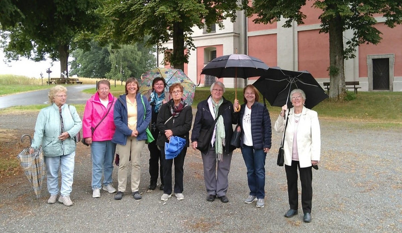 Der Arzberger Bonibus startete mit 8 Frauen und einem Mann, trotz regnerischem Wetter gut gelaunt, zur Wallfahrtskirche St. Quirin in Püchersreuth. Dort führte uns der Mesner und Kirchenführer Alfons Scharnagl kompetent durch die Geschichte der sehenswerten Wallfahrtskirche. Wir bewunderten den böhmischen Akanthusaltar und bestaunten die wertvolle reich verzierte riesige Monstranz. Zum Abschluss der Kirchenführung sangen wir das Lied zum heiligen Quirinus und erlebten so die wunderbare Akustik der Kirche.