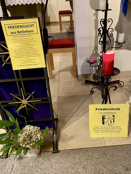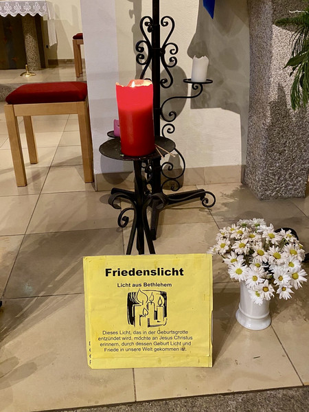 Das Friedenslicht aus Bethlehem ist eine jährliche Aktion, bei der eine Kerze in der Geburtsgrotte Jesu entzündet und in der Adventszeit weltweit als Symbol für Frieden und Hoffnung weitergegeben wird. Im Regensburger Dom wurde das Friedenslicht am 3. Advent mit einer Aussendungsfeier an die Pfarreien im Bistum weitergegeben. Heute hat nun unsere Bad Weißenstädter Mesnerin Annemarie Beck das Licht in Marktredwitz abgeholt und in unsere Pfarreiengemeinschaft gebracht. Vergelts Gott!