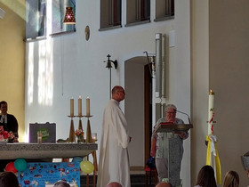 „Gottes Liebe ist so wunderbar“, beim fröhlichen Bewegungslied, das ihm die Kindergottesdienstkinder zum Abschied sangen, machten Thomas Kern und dann schon bald fast die ganze Gemeinde mit. So wunderbar. Für Trauer war da erstmal kein Platz. Über den Rucksack mit Proviant freute sich der Hobbywanderer sichtlich.