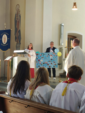 Anika Reichel sprach für die Ministranten. Sie dankte Thomas Kern für die vielen gemeinsamen Aktionen. Kern teilte sogleich schmunzelnd die Erinnerung an ein Zeltlager, an dem er als „Aufpasser“ dabei war und nach einer sehr kurzen Nacht zum Frühstück geweckt wurde – um 4:30 Uhr! Von den Ministranten gab es zur Erinnerung eine bunte Collage aus vielen Fotos aus den letzten 10 Jahren.