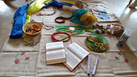 Für 10.00 Uhr war Frau Haska ins Pfarrheim eingeladen, sie überraschte uns mit einem Koffer voller Utensilien, die aus der Ukraine stammten. Damit erfuhren wir auch das Thema des Vortrages, den sie uns halten wollte. Zunächst stellte sie uns die mitgebrachten Gegenstände vor und wir legten damit eine gestaltete Mitte in unseren Stuhlkreis. Es waren wunderbare Handarbeiten dabei, ebenso Schmuckstücke, je eine Bibel aus Russland und der Ukraine, Bücher über das Land und natürlich auch blau-gelbe Fahnen. Durch Portraits von Frauen, die sie selbst kennt, kamen wir ins Gespräch und erfuhren wirklich interessante Details über dieses Land.