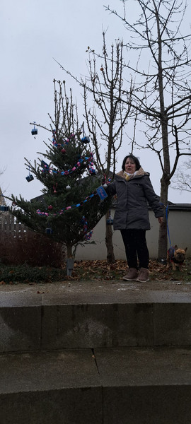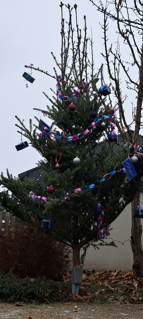 In leichten Schneegestöber haben Frau Rammonat und Frau Kauer den Weihnachtsbaum auf dem Mehrgenerationenplatz für den Adventstreff am Weihnachtshaus von Röslau geschmückt. Frau Rammonat hat die Farben des Frauenbund Logos Rosa und Blau gewählt und schöne Girlanden, Päckchen und Kugeln erstellt. Vielen Dank dafür.