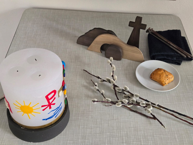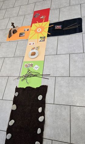 Am Vormittag des Karfreitags trafen sich die Jüngsten der Pfarreiengemeinschaft mit ihren Eltern, um gemeinsam einen Kinderkreuzweg zu feiern. Dabei schauten sie auf die Ereignisse der Karwoche und durften über ein Bodenbild aktiv die Zeit von Jesu Einzug in Jerusalem über das letzte Abendmahl mit seinen Jüngern, den Verrat im Garten Gethsemane, die Verurteilung unter Pontius Pilatus, seine Verspottung und Kreuzigung, seine Grablegung und die Auferstehung durchleben. Mit viel Eifer blickten die Kinder auf die Tage von Palmsonntag, Gründonnerstag, Karfreitag und Karsamstag bis zum Ostersonntag!