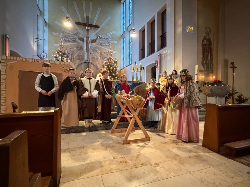 17 Kinder der Pfarreiengemeinschaft Marktleuthen / Röslau, Kirchenlamitz und Bad Weißenstadt, darunter sieben der diesjährigen Erstkommunionkinder, haben sich in den letzten 4 Wochen vor Weihnachten unter der Anleitung von Bianca Schlötzer auf das Krippenspiel am Hl. Abend vorbereitet. Die zentrale Rolle hatte in diesem Jahr der Weihnachtsstern, der die Weihnachtsgeschichte aus seiner Sicht erzählte.