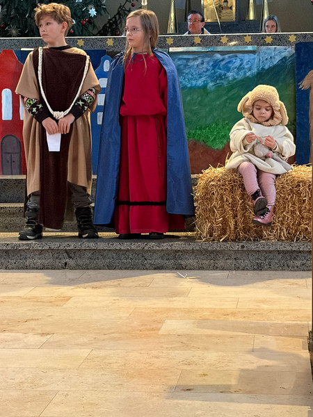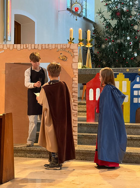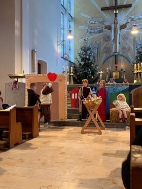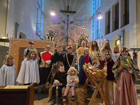 Die Gottesdienstbesucher, überwiegend Familien mit ihren Kindern, bekamen im Krippenspiel erzählt und vor der Kulisse Bethlehems vorgespielt, wie sich die Geschichte um Josef und Maria bei der Herbergssuche einst zugetragen hat. Hirten und Könige knieten nieder vor dem Jesuskind, brachten ihre Liebe (symbolisiert durch ein großes Herz) und Weihrauch, Gold und Myrrhe als Geschenke zum Kind - auch die Tiere im Stall bestaunten aufgeregt das Kind in der Krippe.