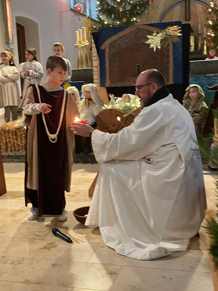 Die Kinder brachten dann das Licht von der Krippe zu den Kirchenbesuchern und als in der Kirche alles wunderschön erleuchtet war stimmte man gemeinsam in das Lied „Zu Betlehem geboren“ ein.