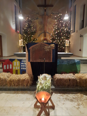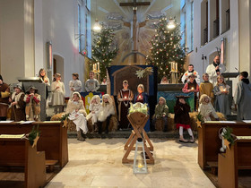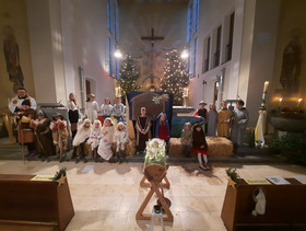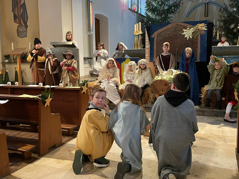 Die Krippenspielkinder waren dabei als 3 Kinder (Sarah Sailer, Joel Schumann und Paul Neef), als 3 Hirten (Anita Mate, Diego und Nerea Oehrlein), als Wirt (Paul Schenker) und Wirtin (Lilly Müller), als Frau aus Betlehem (Romy Raithel), als junges Mädchen (Sophia Schneider) und als Maria (Elisa Mühlhans) und Josef (Benedikt Schlötzer) verkleidet und spielten ihre Rollen bravourös.