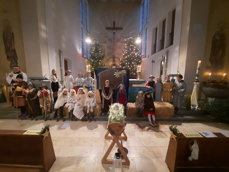 Dabei spielten 19 Kinder aus unserer Pfarreiengemeinschaft Marktleuthen/Röslau-Kirchenlamitz-Weißenstadt, darunter die drei Kommunionkinder Paul Neef, Sarah Sailer und Paul Schenker, die Weihnachtsgeschichte in vier Szenen nach. Die Kinder gehören in diesem Krippenspiel zu den ersten Augenzeugen der Menschwerdung Gottes. Im Stall von Betlehem sehen sie das neugeborene Kind, Jesus, in der Krippe und hören, dass sich die großen Verheißungen des Alten Testaments nun erfüllt haben.