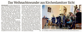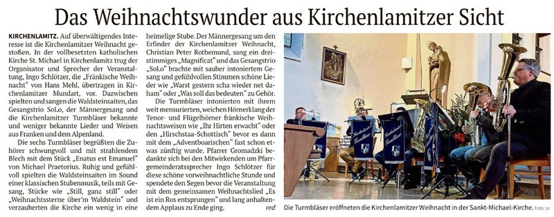Die Kirchenlamitzer Weihnacht war ein voller Erfolg. In der vollbesetzten katholischen Kirche St. Michael in Kirchenlamitz trug der Organisator und Sprecher der Veranstaltung, Ingo Schlötzer, die „Fränkische Weihnacht“ von Hans Mehl, übertragen in Kirchenlamitzer Mundart vor. Dazwischen spielten und sangen die Waldsteinsaiten, das Gesangstrio SoLo, der Männergesang und die Kirchenlamitzer Turmbläser bekannte und weniger bekannte Lieder und Weisen aus Franken und dem Alpenland.