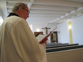 Danach sang unser Kantor Christian Peter Rothemund alleine und ohne seine altbewährte Choralschola den Ersten Psalm „Beim Herrn ist Barmherzigkeit und reiche Erlösung“ (Ps 64), das Canticum „Erbarme dich meiner o Gott, erbarme dich meiner“ aus dem Buch des Propheten Jesaja (Jes 38,10- 13a.14cd.17-20) und den Zweiten Psalm „Alles was atmet, lobe den Herrn“ (Ps 150).