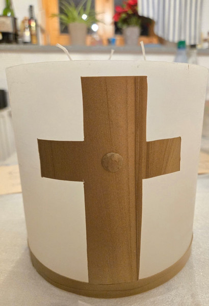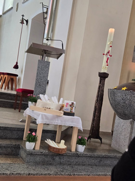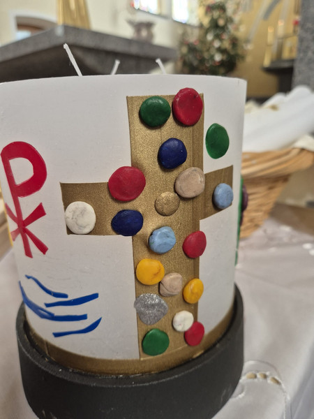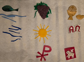 Vor dem gemeinsamen Gottesdienst mit den Kommunionkindern und Erwachsenen trafen sich die KiGo-Kids im Pfarrheim um eine neue Jesuskerze für die künftigen Gottesdienste zu gestalten. Sie machten sich Gedanken über Aussagen Jesu, wie "Ich bin das Licht der Welt", "Ich bin der Weinstock", "Ich bin das lebendige Wasser" und alte christliche Symbole, wie Alpha und Omega, den Ichtys-Fisch, das Christus-Monogramm...