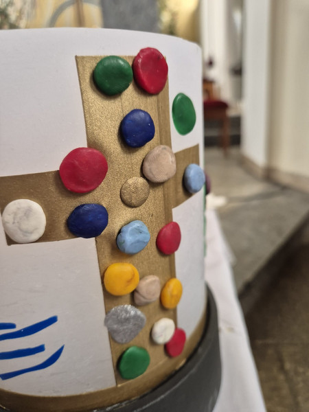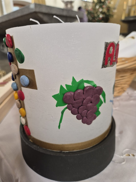 Zu allen Bezeichnungen brachten die Kinder vorbereitete Wachssymbole auf der neuen Kerze an und durften bunte, kleine Wachskugeln als Zeichen für sich selbst bei Jesus (Kreuz) anheften. Sinnbildlich für das Bibelwort "Ich bin der Weinstock, ihr seid die Reben"!
