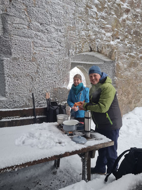 Gestartet hat der Ausflug mit dem Aufstieg zur Ruine mit den noch unentzündeten Fackeln. Als wir nach einem kurzen Marsch oben angekommen waren, gab es eine kleine Stärkung für alle. Heiße Wiener in der Semmel sorgten nach dem Aufstieg wieder für einen neuen Energieschub. Danach blieb noch ein bisschen Zeit, um den Moment und die teils vernebelte Aussicht zu genießen.