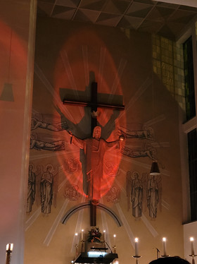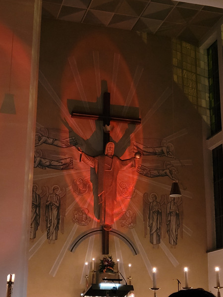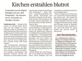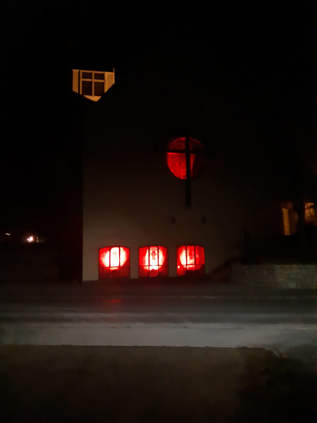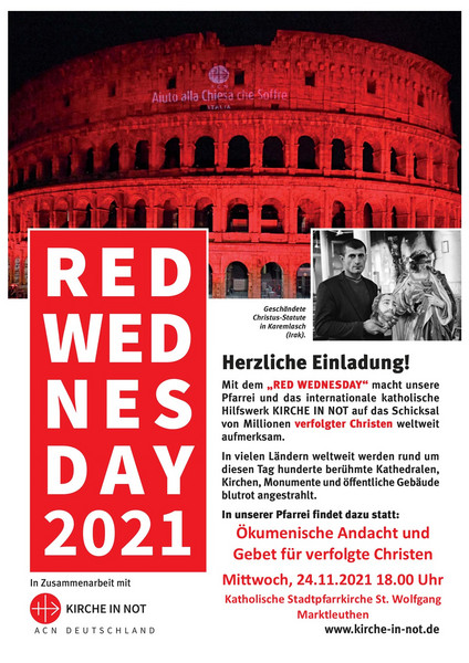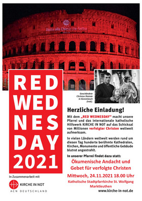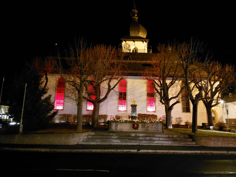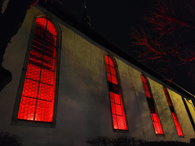 Nach der Abendandacht erstrahlte das Innere beider Kirchen, der katholischen St. Wolfgangskirche wie auch der evangelischen St. Nikolauskirche in der Farbe rot als Zeichen des Gedenkens an das Blut vieler verfolgter, gequälter und oftmals getöteter Christen unserer Zeit.