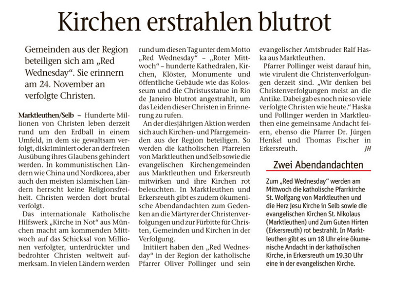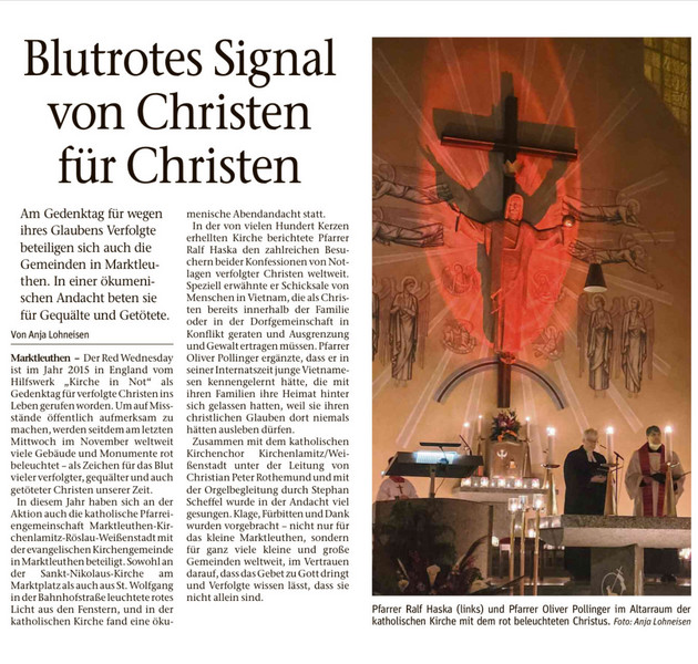 In einem ökumenischen Gottesdienst am "red wednesday", dem Gedenktag für verfolgte Christen, haben Christen beider Konfessionen in Marktleuthen gesungen, gebetet, Gott geklagt und ihn gelobt.