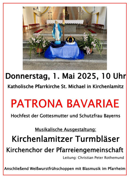 Am 1. Mai feierte die PG Marktleuthen/Röslau-Kirchenlamitz-Weißenstadt das Hochfest der Gottesmutter Maria und Schutzfrau Bayerns mit einer Eucharistiefeier in Kirchenlamitz.