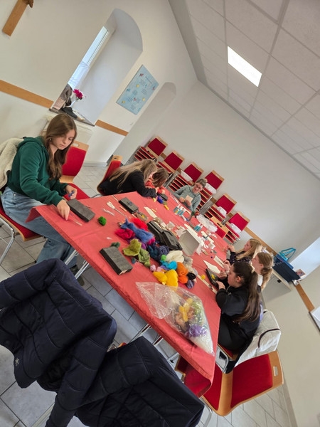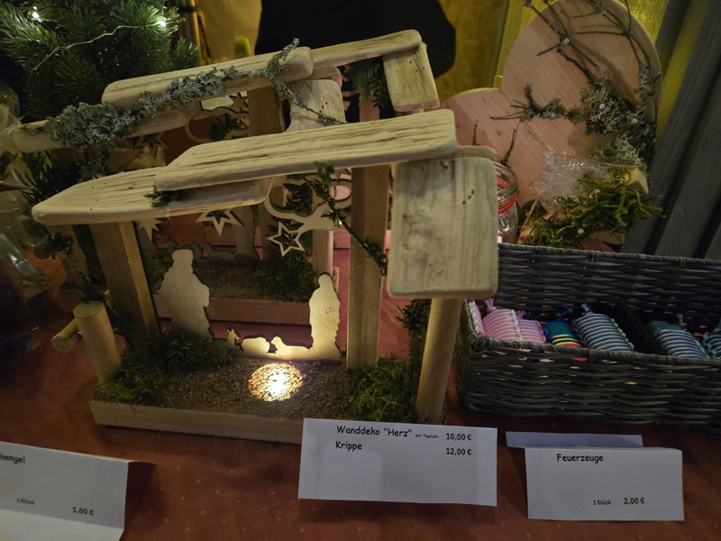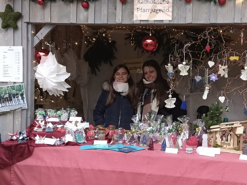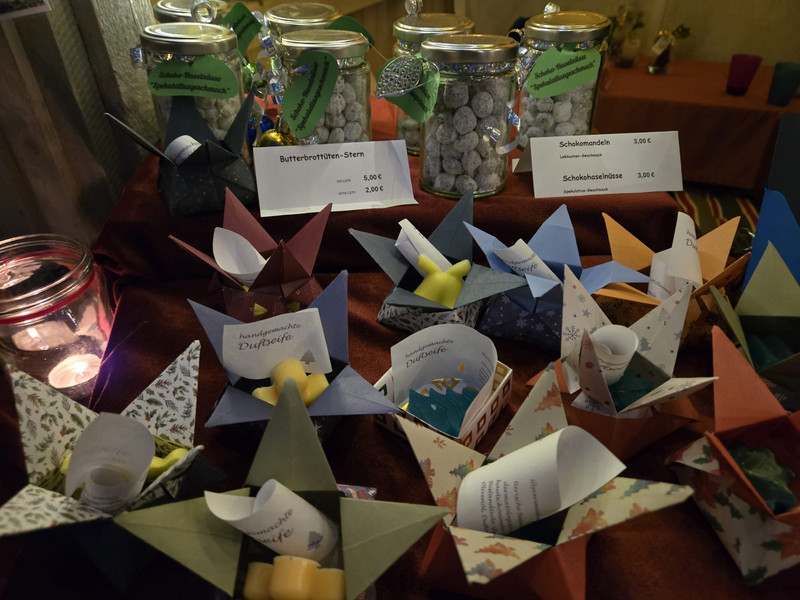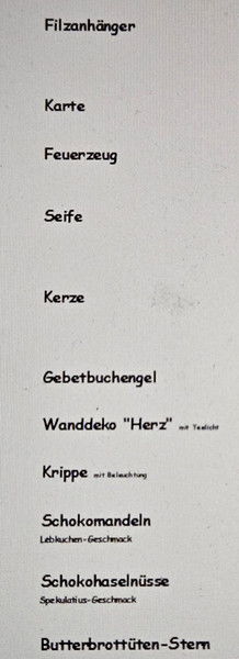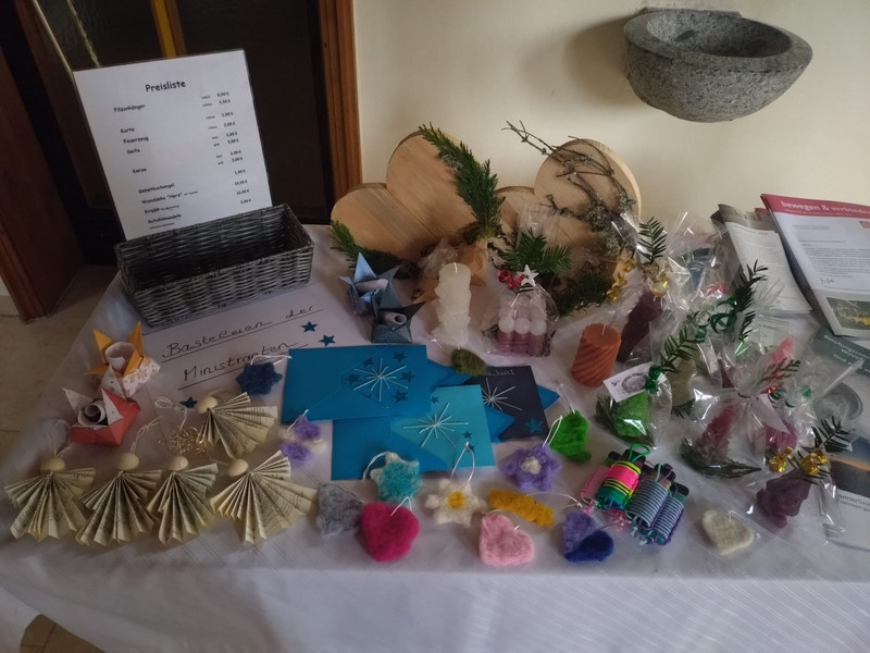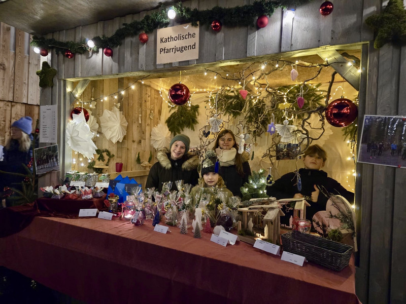 Fleißig verkauften sie ihre selbst hergestellten Waren. Das Sortiment reichte von Schokomandeln /-nüssen über Kerzen, ummantelte Feuerzeuge, Duftseifen, Filzanhänger, Karten, Gebetbuchengeln, Papiersternen hin zu kleinen Krippen und Holzherzen und fand reichlich Abnehmer.