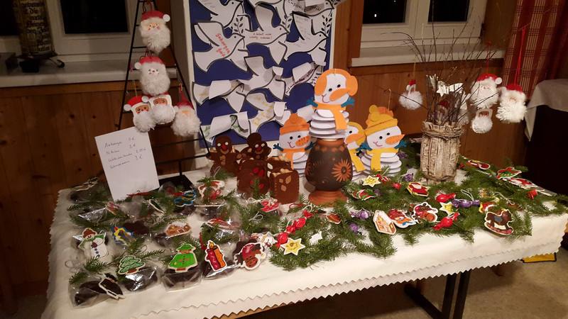 Zusätzlich boten die Kinder des Kindergottesdienstteams der beiden Familien Mindel und Hüttel ihre selbstgebastelten Geschenkartikel an. Dabei gab es wunderschöne Weihnachtsdeko wie Nikoläuse, Schneemänner und Lebkuchentaschen zu bestaunen.