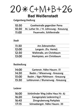 Veranstalter: Pfarreiengemeinschaft Marktleuthen/Röslau-Kirchenlamitz-WeißenstadtDie Sternsinger sind auch in 2026 wieder in der Pfarreiengemeinschaft unterwegs um den Segen