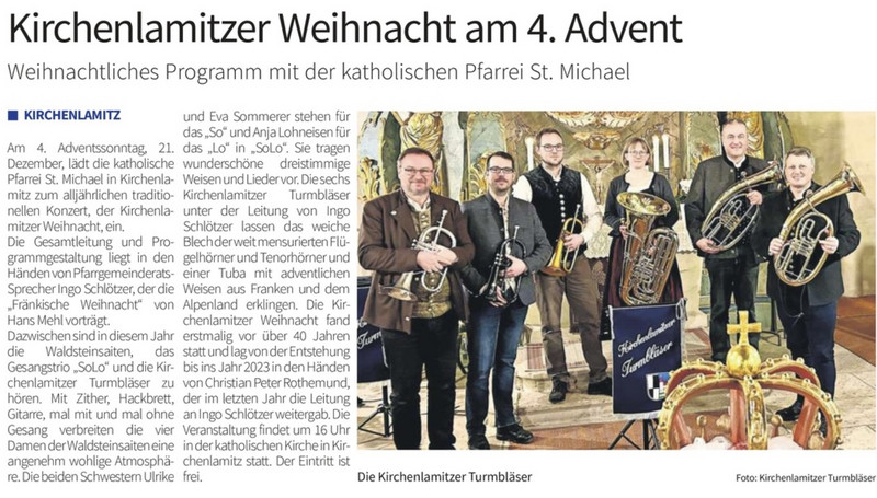 Veranstalter: Pfarrei KirchenlamitzTraditionelles Weihnachtskonzert mit den Waldsteinsaiten, dem Gesangstrio SoLo und den Kirchenlamitzer Turmbläsern.