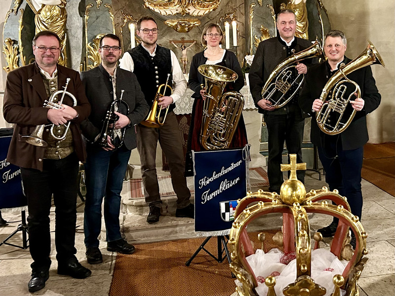 Die sechs Kirchenlamitzer Turmbläser unter der Leitung von Ingo Schlötzer lassen das weiche Blech der weit mensurierten Flügelhörner und Tenorhörner und einer Tuba mit adventlichen Weisen aus Franken und dem Alpenland erklingen.