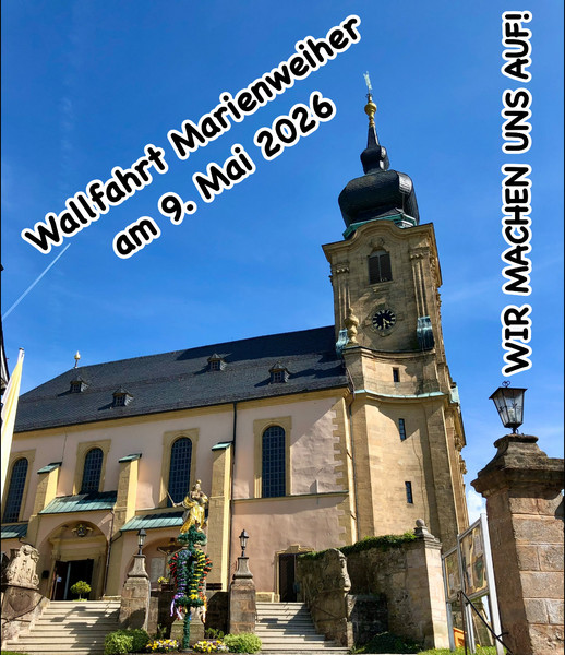 Veranstalter: Pfarreiengemeinschaft Marktleuthen/Röslau-Kirchenlamitz-WeißenstadtIn diesem Jahr findet unsere Wallfahrt nach Marienweiher am 09.05.2026 statt.